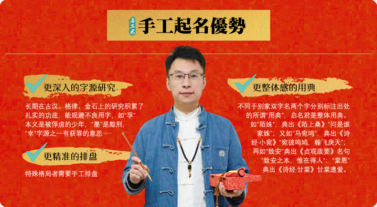 考虑到诸位父母对构成名字的音、形、典、义、象、理六维及其他方面有着不同程度的要求,杰洛老师这里提供更多个性化的人工筛选与手工起名服务。