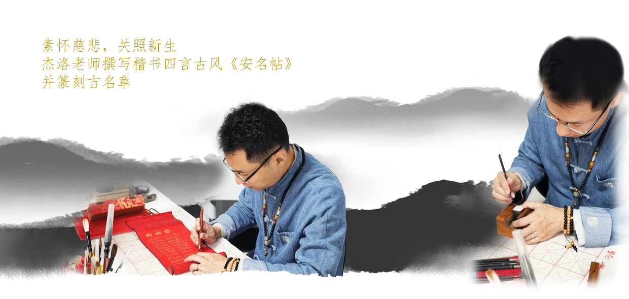 取名定毕,喜金厚重者,杰洛老师会用金墨锦帛楷书撰写四言古风体《安名帖》,或是为孩子手刻“吉名章”(篆刻姓名章),皆锦盒函之,算作是留给孩子的一个纪念,一份加持,您更可以持其在祖祠、寺庙、道观祈求平安,庄重其事。